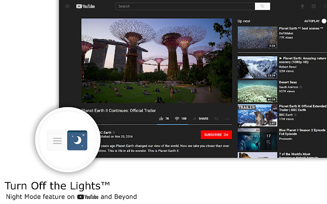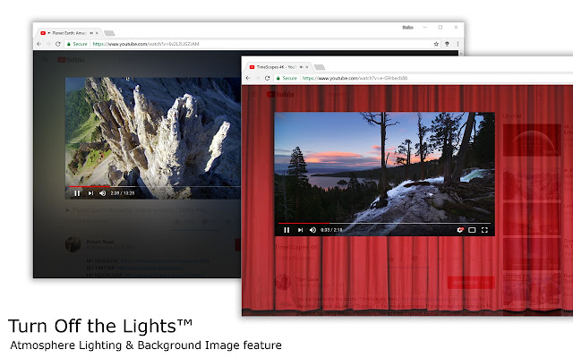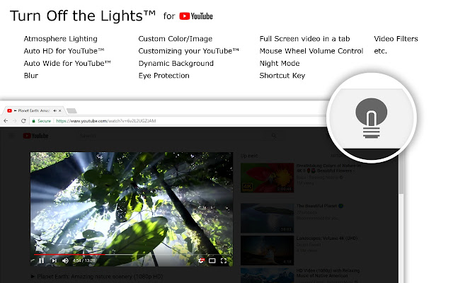 With a single click on the lamp button, the page will fade to dark. And automatically focus on the video. By clicking on it again, the page will return to normal.Turn Off the Lights is a lightweight and useful add-in designed for a more comfortable watching experience. It works for all known video sites such as YouTube, Vimeo, Dailymotion, Hulu, Metacafe, YouKu, etc. Not only this but these extensions are compatible with Google Chrome, Apple Safari, Mozilla Firefox, Opera, Microsoft Edge, Maxthon and Yandex web browsers.A few great features in this browser extension:+ Turn the lights back on, by clicking on it+ Support multiple video sites: YouTube, HTML5 video,... and more+ Customize your YouTube:Auto HD: Set videos to play in HD automatically. Users can select from highres > 8K > 5K > 4K > 1080p > 720p > 480p > 360p > 240p > 144p > default+ Option to Show Dimness Level BarAuto Wide: Automatically plays the video on the widest mode,... and more + Easter Eggs:Shortcut key: T -> Do you like a real movie theater feeling?+ Option to make the screen dark when the user clicks on the play button+ Option to Flash Detection+ Option to turn on/off the fade in and fade out effects + Custom colorsAlt + F10 to enable/disable the Eye Protection feature+ Option Eye Protection for when it's night. And with whitelist/blacklist filter+ Option atmosphere lighting that shows a glow around the video player+ Options to shortcut keys:+ Option to show the dark layer on the top of the window Ctrl + Shift + L to toggle the lights+ Option to show the Audio Visualization effect on top of the current HTML5 video (Blocks, Frequency and Music Tunnel)Alt + F8 to restore the default opacity value Alt + F9 to save the current opacity valueAlt + (arrow up) to increase the opacityAlt + (arrow down) to decrease the opacityAlt + * to toggle the lights on all open tabs+ Option Camera Motion + Option Speech Recognition+ Option for Mouse Wheel Volume Control for each HTML5 video player+ Option to add a filter to the current HTML5 video player (grayscale, sepia, invert, contrast, saturate, hue rotation and brightness)+ Option to stop YouTube and HTML5 videos from automatically playing.+ Option to fill the HTML5 video player in your whole current tab+ Option to loop the current HTML5 video player+ Option to place the Night Mode switch to toggle YouTube in black or white theme. And with whitelist/blacklist filterTimestamp: Activate the Night Mode within the chosen time Blackout: Dims the web page and activates the Night Modehttps://www.twitter.com/TurnOfftheLight+ Option Video Screen capture for YouTube and all the HTML5 video players One frame snapshot to customize the screenshot with filters such as Invert, Blur, Saturation, Grayscale, Hue rotate, etc. And finally save the screenshot as PNG, JPEG, BMP or WEBP image formathttps://plus.google.com/+turnoffthelights/posts+ Option to Zoom in video player + Option to HTML5 video playback rate + and more... Don't forget to like & Follow Us: Facebook https://www.facebook.com/turnoffthelight Google+ Twitter PinterestNote: YouTube is a trademark of Google Inc. Use of this trademark is subject to Google Permissions. Turn Off the Lights™ is not created by, affiliated with, or supported by Google Inc.https://www.pinterest.com/turnoffthelight Instagram https://www.instagram.com/turnoffthelights YouTube https://www.youtube.com/c/turnoffthelightsFeel free to contact us if there is any problem or suggestion.Compatible with Adblock, AdBlock Pus, uBlock Origin Chrome extension.
