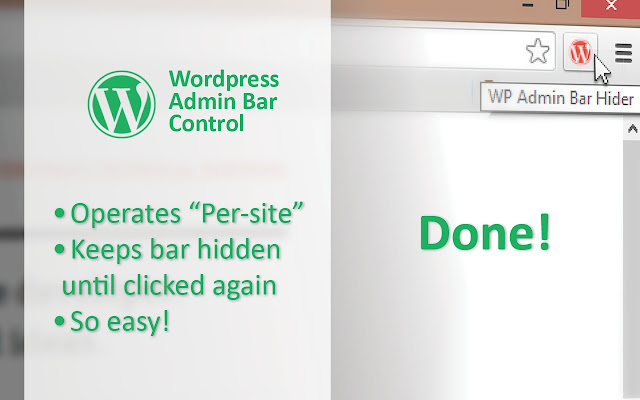 This plugin isn't for those who want to get rid of the admin bar completely, you don't need an extension for that. Wordpress Admin Bar Control is designed for those who want easy concealment of the admin bar on a per-domain basis. This means that all you need to do is click the plugin's action button once and the admin bar will vanish immediately-- between page loads and sessions alike. Want the bar back? No problem. Just click the button again and the admin bar will be restored instantly!